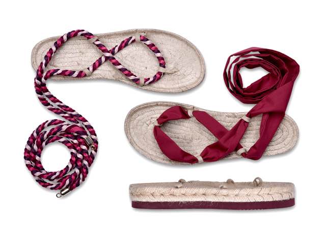 Le suole sono disponibili in vari colori e due modelli: flat oppure con zeppa alta 5 cm. I lacci da annodare alla schiava intorno alla caviglia sono trattenuti da 6 passanti e possono essere sfilati e intercambiati tra loro scegliendo tra diversi colori e due materiali, tessuto o corda.