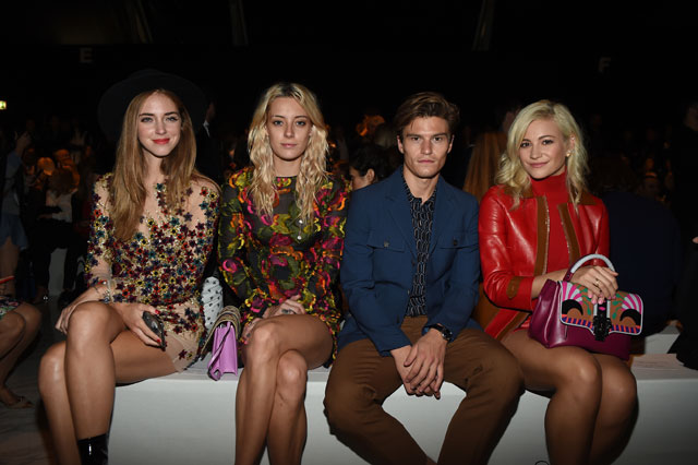 Pixie Lott e Oliver Cheshire, Chiara Ferragni, Martina Colombari, Federica Fontana, Eliana Miglio, Anna Safroncik, Hofit Golan, Chloe Norgaard (vestite in Blumarine), Erica Pelosini (vestita in Blugirl), Kristina Bazan, Candela Novembre, Valentina Siragusa e Helena Bordon hanno assistito alla sfilata Blumarine collezione Primavera/Estate 2016, presso palazzo Serbelloni a Milano.