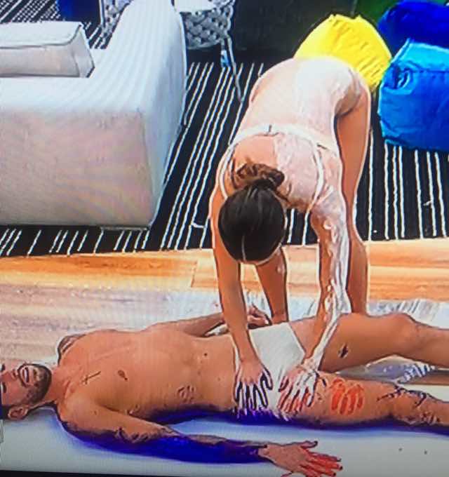 Durante la realizzazione del quadro artistico, Ignazio dipinto per metà si sdraia sul quadro di cartone mentre Cecilia cerca di “spingerlo” contro la tela perchè rimanga bene impressa la forma. Ed è proprio in quel momento che l’attenzione della bella argentina si ferma sui gioielli di famiglia di Ignazio e la sua mano finisce proprio li, come potete vedere dalla foto sotto.